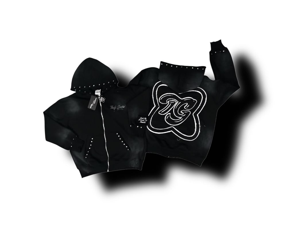 From Pull over to Zipup, An oversized relaxed, very comfortable and warm with a custom TG zipper. Also having a faded look with acid spray. with a double layered TG on the back for the “blackout” effect