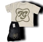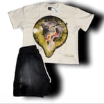 100% cotton shirt with A DTG vision print on the front, followed with “TRULYGOATED” embroidered at the bottom left hand side of shirt, W/TG logo distressed embroidered on the back hand side to go with matching black cotton shorts, That have “TRULYGOATED” going up the right leg & The “TG” stamp on the left hand side.